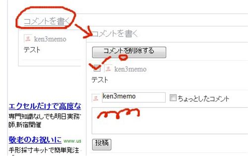 コメントを書く の リンクを押すと、既存のコメントを削除するチェックボックスが現れるので、 チェックしてコメントを削除する。コメントを書く の 下に削除機能が埋まっている、そんなお話でした。↑で終わる予定が、間違っていた(笑) この方法だと、自分の…