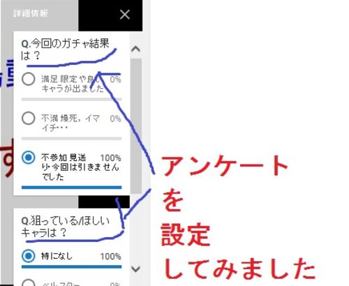 クリエイターツール から 動画の管理を選択後、 編集▼から カードを選択して、 アンケートを作成します↓ぐだぐだの操作動画 【YouTube】アンケート機能を使う カードで作成 【三流君】 - YouTube www.youtube.com質問と選択肢を設定して使ってみてください。…