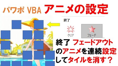 終了、フェードアウトのアニメーションを複数の図形・シェイプに連続でセットする。 パワーポイントのアニメを設置するマクロコードの紹介と解説です。 タイルで隠す?アニメーションの終了・フェードで消す#PowerPointVBA #アニメーション #出して消す #直…