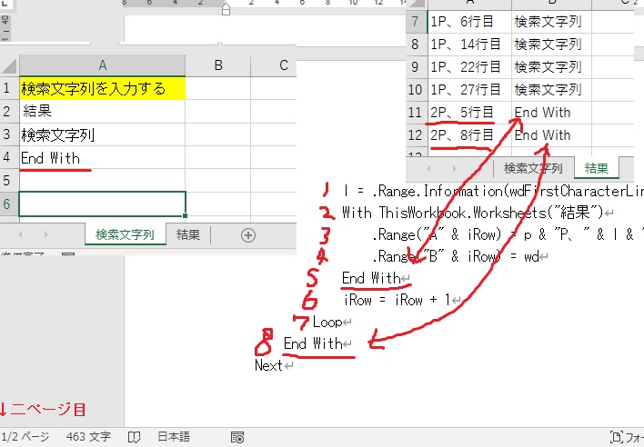 エクセルの<検索文字列>シートのA列に列挙されている検索文字列群(A1からA2、A3、、、に検索したい文字が入力されています)がwordファイルの文章中に使われているかそれぞれ検索し、出現ページ・行を<結果>シートに出力したい。