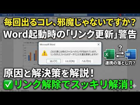 Wordで作業中に突然現れる「この文書には、他のファイルへのリンクが含まれています。リンクされたファイルのデータでこの文書を更新しますか?」というメッセージ。一体どうすればいいの?と困っている方も多いのではないでしょうか。このメッセージは、WordファイルがExcelのグラフなど、他のファイルとリンクされている場合に表示されます。このブログ記事では、このリンク更新メッセージへの対処法を、動画で分かりやすく解説します。